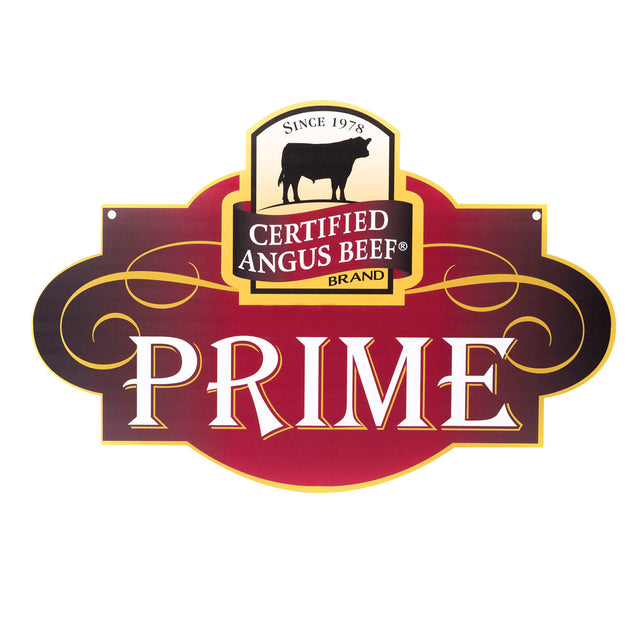 A double-sided sign for hanging featuring the Certified Angus Beef(R) brand Prime logo (29.25 in. X 15.25 in.). This does not include a rod for hanging. Limit one per customer.