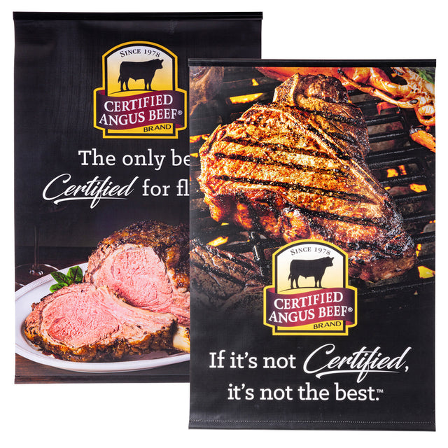 A two-sided, vinyl sign featuring the Certified Angus Beef(R) brand logo and quality statements (24 in. X 36 in.). This includes a dowel rod for easy hanging.