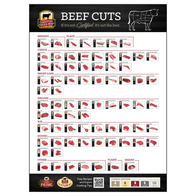 Easily access information about Certified Angus Beef(R) brand cuts with this styrene Retail Beef Cuts chart (22 in. X 30 in.). Includes removable, double sided tape for easy hanging and a QR code.