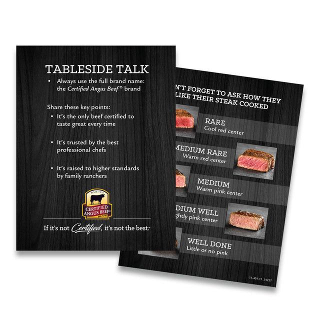 Teach your waitstaff how to make sales with these newly styled Certified Angus Beef(R) brand fact cards. Cards include talking points on the benefits of the brand and degrees of doneness guidelines. 25 cards per pack